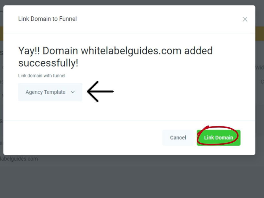 Underneath the "Yay" message, you'll see a dropdown with all your funnels and websites listed. Simply select the funnel/website you want and click Link Domain.