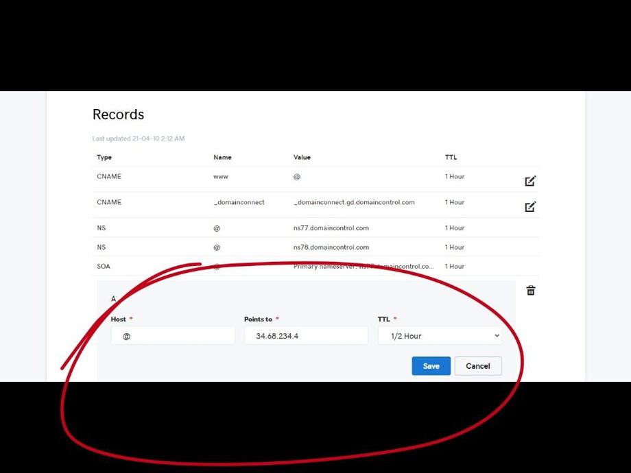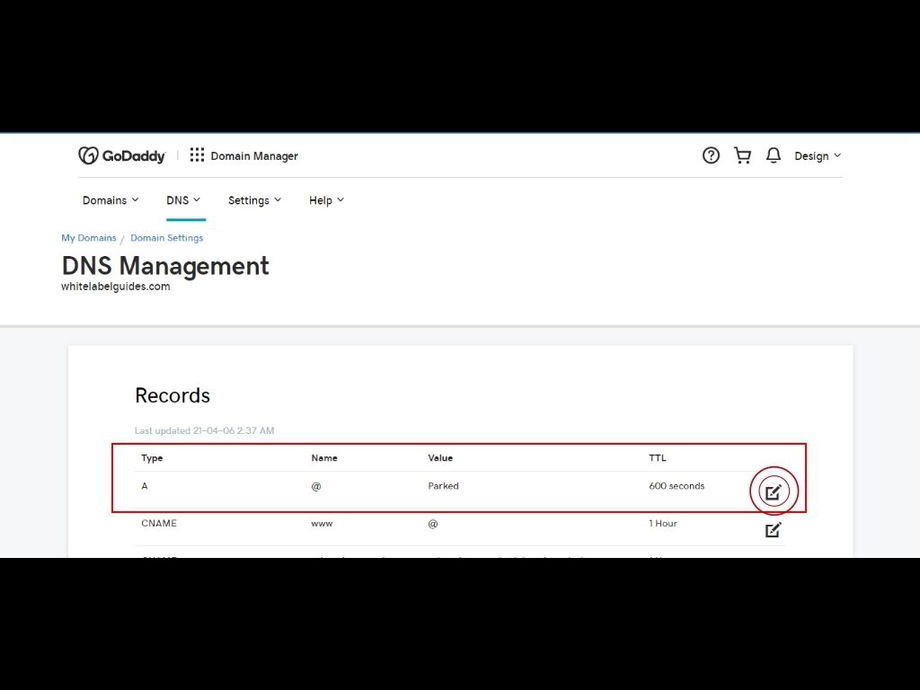 Here is where you’ll add your "A" record. If you already have an "A" record, click the icon to edit the record.