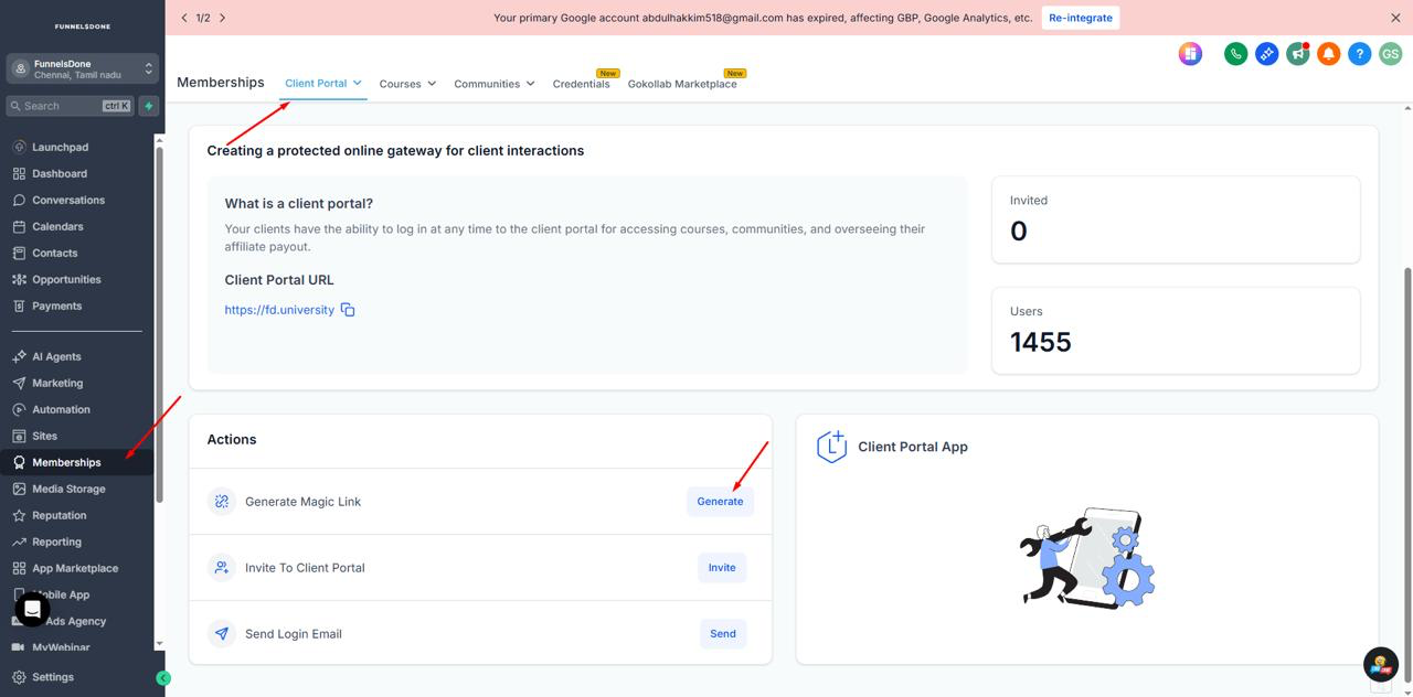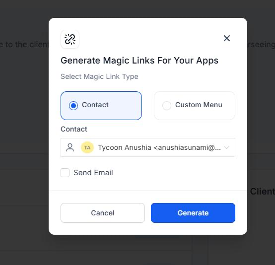 To do so, please navigate to the Memberships tab and generate the magic link for the contact. The magic link enables login to the account without requiring a password. Additionally, you have the option to send the magic link to the contact via email.
